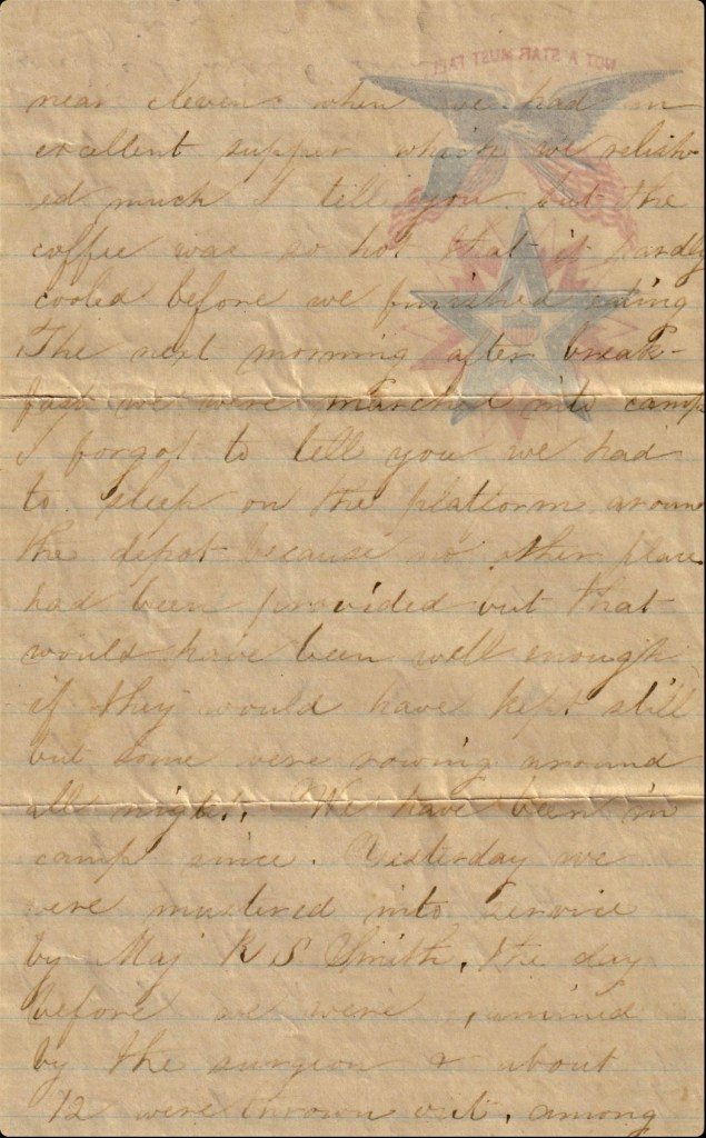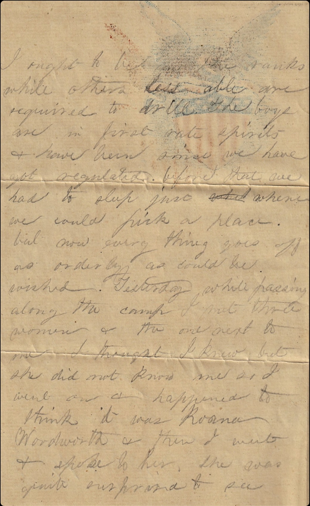 Yesterday while passing along thru camp I met three women and the one next to me I thought I knew but she did not know me so I went on and happened to think it was Roana Wordworth. And then I went and spoke to her. She was quite surprised to see me here. They are well. I have been up to town once since we came into camp and staid an hour or two and have been out to the lake twice to bathe. We were glad of that for it’s a nice place and the water is warm. I wish you had time to come out here and see us as we are now. A great many folks are in the camp everyday to see the boys. If you could come out you would enjoy the visit first rate.