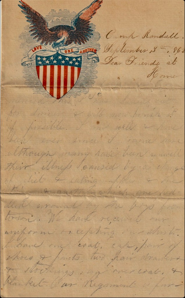Just after I commenced this, I was called out for dinner and will now finish it if possible. I am well and have been ever since I came here although many have been unwell, their illness caused by a change of diet and eating apples and one thing and another which are peddled around by the boys from town. We have received our uniforms excepting our shirts. I have one coat, cap, pair of shoes and pants, two pair drawers and stockings, an overcoat and blanket. Our regiment is furnished with better clothing than any other in or from the state. Our coats are as fine as broadcloth.