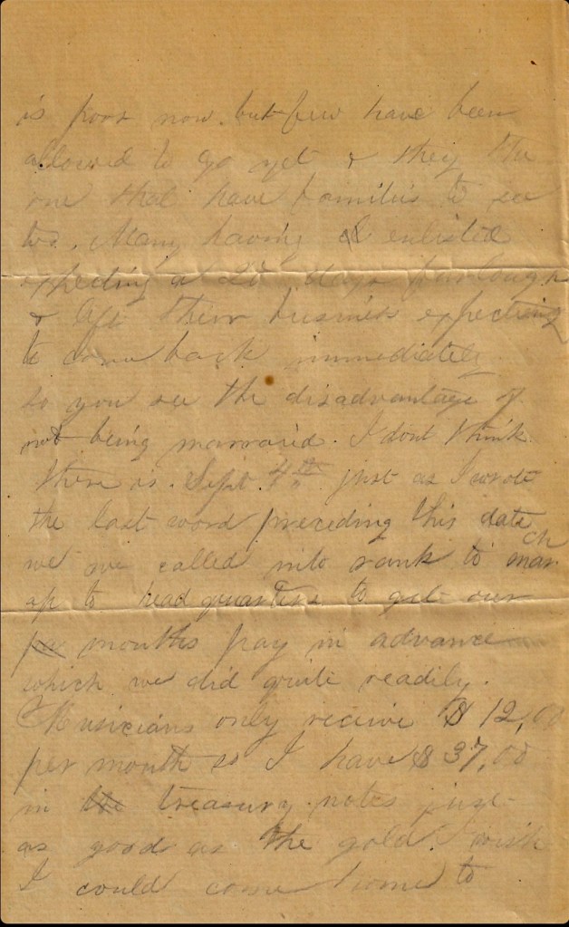 Sept. 4th. Just as I wrote the last word preceding this date we were called into rank to march up to headquarters to get our month’s pay in advance which we did quite readily. Musicians only receive $12.00 per month so I have $37.00 in Treasure notes—just as good as gold. I wish I could come home to bring it for I don’t like to risk it in letters but if I can’t come, I shall send it in a few days.