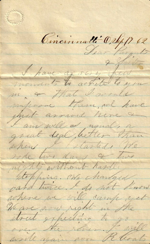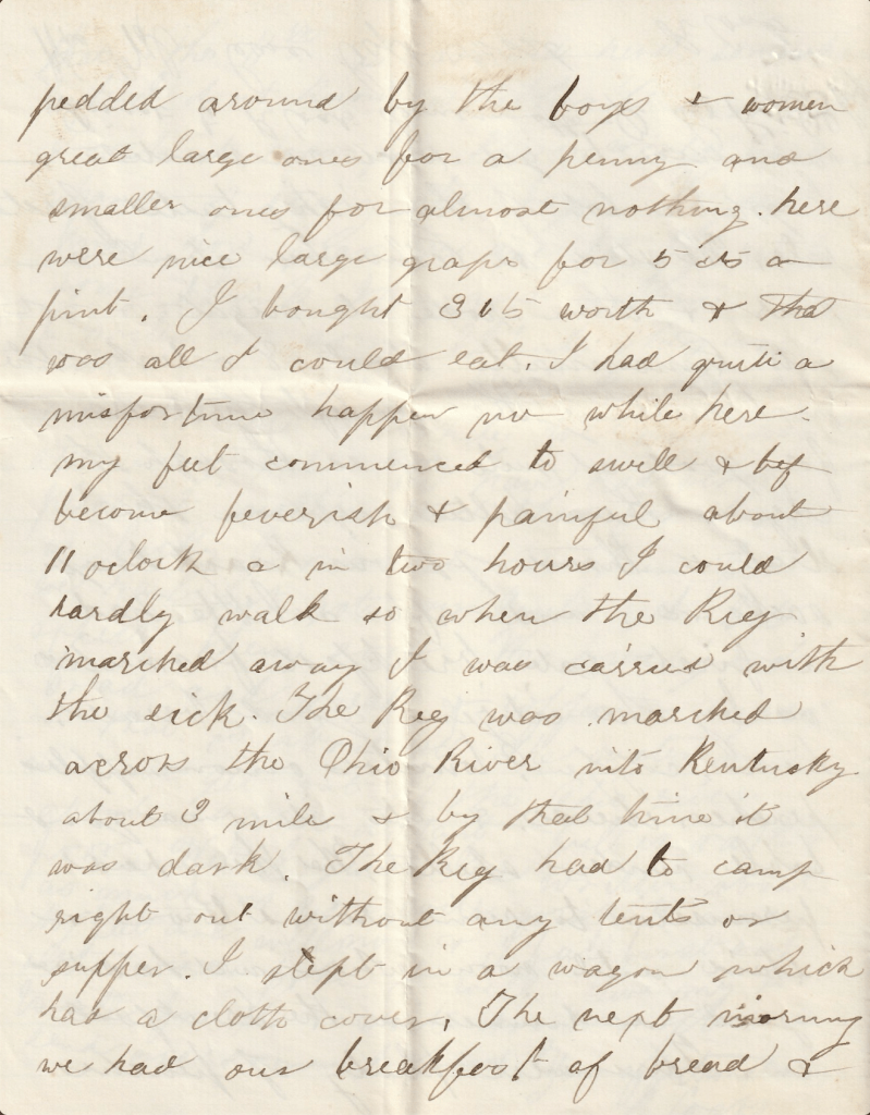 I had quite a misfortune happen to me while here. My feet commenced to swell & became feverish & painful about 11 o’clock and in two hours I could hardly walk so when the regiment marched away, I was carried with the sick. The regiment was marched across the Ohio River into Kentucky about 3 miles and by that time it was dark. The regiment had to camp right out [in the open] without any tents or supper. I slept in a wagon which had a cloth cover.