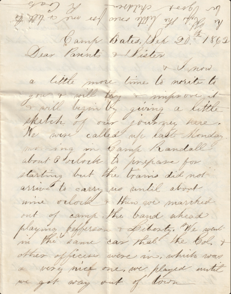 I now have a little more time to write to you and will try and improve it and will begin by giving a little sketch of our journey here. We were called up last Monday morning in Camp Randall about 3 o’clock to prepare for starting but the trains did not arrive to us until nine o’ clock. Then we marched out of camp, the band ahead playing Jefferson & Liberty. We went in the same car that the Col. & the other officers were in, which was a very nice one. We played until we got underway out of town.