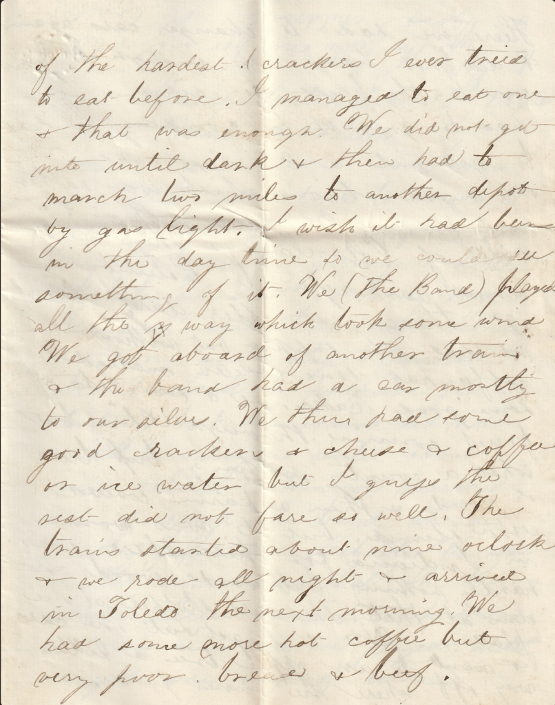 We had a great time between McFarland & Stoughton. The track had sunk about a week previous as much as ten feet & they had just got it toggled up but could not run over it with an engine and we pushed to it and then all the soldiers got out and walked around it & then they pushed the cars across where another engine hitched on and away we went. We turned off at Milton Junction onto the Chicago & Northwestern Railroad and went directly to Chicago. We passed through Janesville but could not see much of it. We saw some country between there & Chicago—the best we saw at all. We had some hot coffee & some of the hardest crackers I ever tried to eat before. I managed to eat one & that was enough. We did not stop until dark & then had to march two miles to another depot by gas light. I wish it had been in the daytime so we could see something o f it . We (the band) played all the way which took some wind. We got aboard of another train & the band had a car mostly to ourselves. We then had some good crackers & cheese & coffee or ice water but I guess the rest did not fare so well. The trains started about nine o’clock. l we rode all night & arrived in Toledo the next morning. We had some more hot coffee but very poor bread & beef.