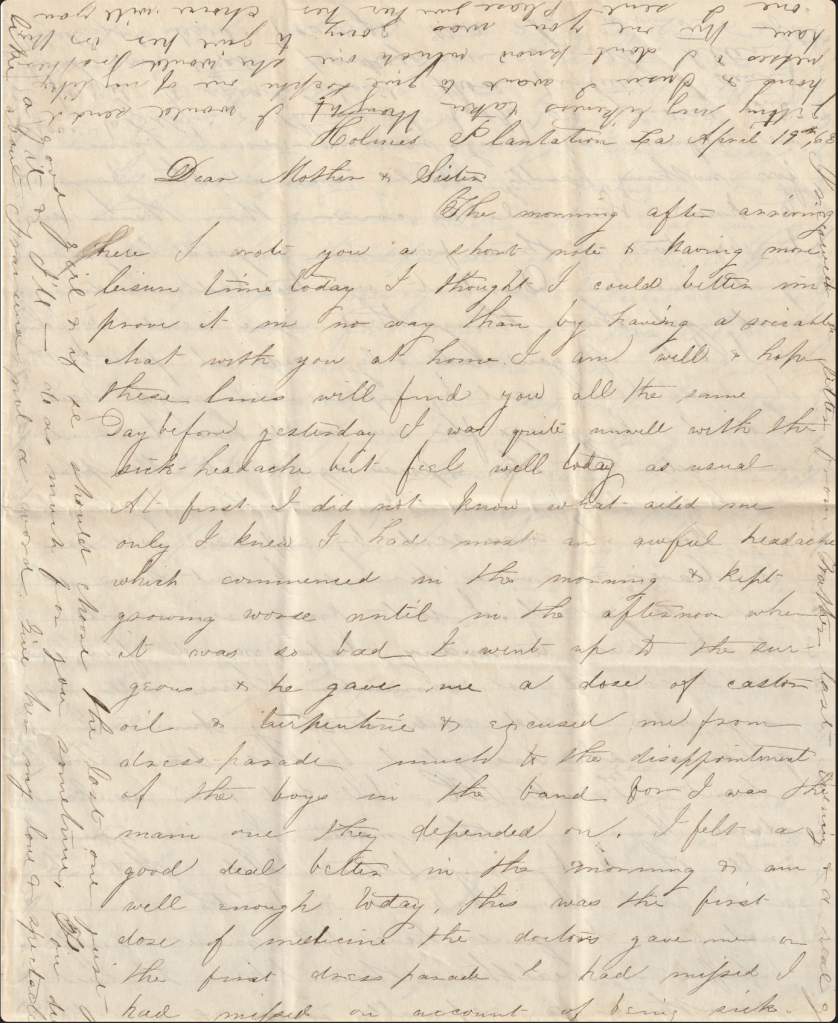 The morning after arriving here I wrote you a short note and having more leisure time today, I thought I could better improve it in no way than by having a sociable chat with you at home. I am well & hope these lines will find you all the same. Day before yesterday I was quite unwell with the sick headache but feel well today as usual. At first I did not know what ailed me—only I knew I had most awful headache which commenced in the morning & kept growing worse until in the afternoon when it was so bad I went up to the surgeons & he gave me a dose of castor oil & turpentine & excused me from the dress parade, much to the