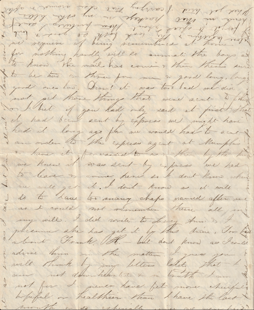 Dear! it was to bad we did not get those things that were sent to John & I feel if you had only said at first that it had been sent by express we might have had it long ago for we would have had to send an order to the express agent at Memphis and have it forwarded to us and then by the time we knew it was sent by express, we had to leave and come here so I don’t know where we will get it.