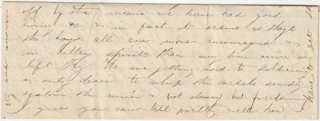 I don’t know as it will do to have too many chaps named after me as I could not remember them all in my will. I did write to Lucy Ann & I presume she has got it by this time. Too bad about Frank H, but don’t know as I could advise him in this matter. I guess you will think by my letters lately that I am not down hearted & in truth I am not for I never have felt more cheerful, hopeful or healthier than I have the last month or so—especially since we were paid off. By that we mean we have had good living. In fact it seems as though the boys are more encouraged and better spirits than any time since we left Kentucky. We are getting used to soldiering & only desire to whip the rebels soundly, restore the Union & (not slavery) but freedom. I guess you can tell pretty well how I feel by the way I talk for you were always a pretty good judge of humane nature & could not be very well deceived by me, at any rate.