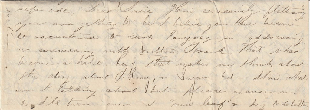 I did not think Abbie could scare you so easily as that about sending small things in a newspaper for most all the boys get things that way & to think of your being in prison—what a preposterous idea. But I suppose it is against the law and it is best to be on the safe side. Dear! Susie, how excessively flattering you are getting to be. I believe you have become so accustomed to such language in addressing or conversing with brother Frank that it has become a habit, hey? That makes me think about the story about Honey, or Sugar, but shaw! what am I t a l k i n g about. But please excuse me & I’ll turn over a “new leaf” & try to do better. Yes, I never could find out what it was & have about made up my mind I am only a common personage after all. I expect it was being praised so that made me think so. Isn’t that it? If I only had time I would praise you ever so much but I have got to finish this tonight so I can’t this time.