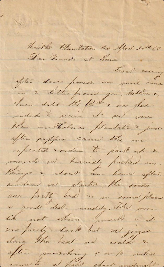 Last evening after dress parade, our mail came in and letters from you, Mother & Susie dated the 12th and was glad indeed to receive it. We were then on Holmes’ Plantation and just after supper came the unexpected order to pack up and march. We hurriedly packed our things and about an hour after sundown we started. The roads were pretty bad and in some places a good deal muddy. The moon did not shine much and it was pretty dark but we jogged along the best we could and after marching 8 or 10 miles, came to a halt about midnight. We were tired enough and prepared to camp down. Our wagons did not come up but