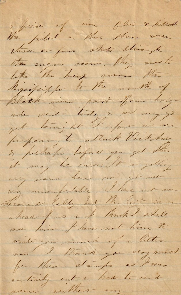 What was our surprise to see two steamboats close by in the morning which had run the blockade past Vicksburg and had run up a bayou to us 6 or 8 miles from the river. They fared pretty hard coming down, I tell you. On one boat there were two shots through the pilot house, one through the smokestack from which a piece of iron flew & killed the pilot and then there were three or four shots through the engine room. They are to take the troops across the Mississippi to the mouth of the Black River. Part of our brigade went today and we may yet go tonight. I expect we are preparing to attack Vicksburg and perhaps before you get this, it may be ours.