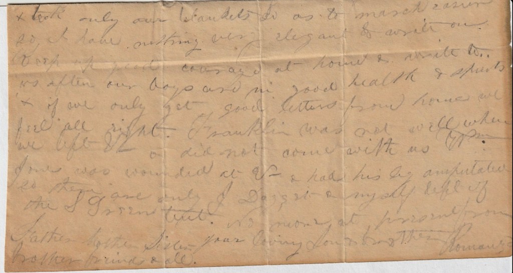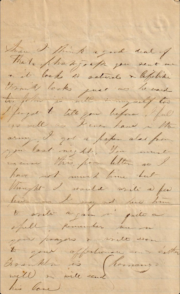 Susan, I think a good deal of that photograph you sent me and it looks so natural and lifelike. Frank looks just as he used to. John is well and myself too. I forgot to tell you before, I feel as well as I ever have in the army. I got a paper also from you last night. You must excuse this poor letter as I have not much time but thought I would write a few lines as I may not have time to write again for quite a spell. Remember me in your prayers and write soon to your affectionate son and brother. Franklin is well and will send his love. — Romanzo