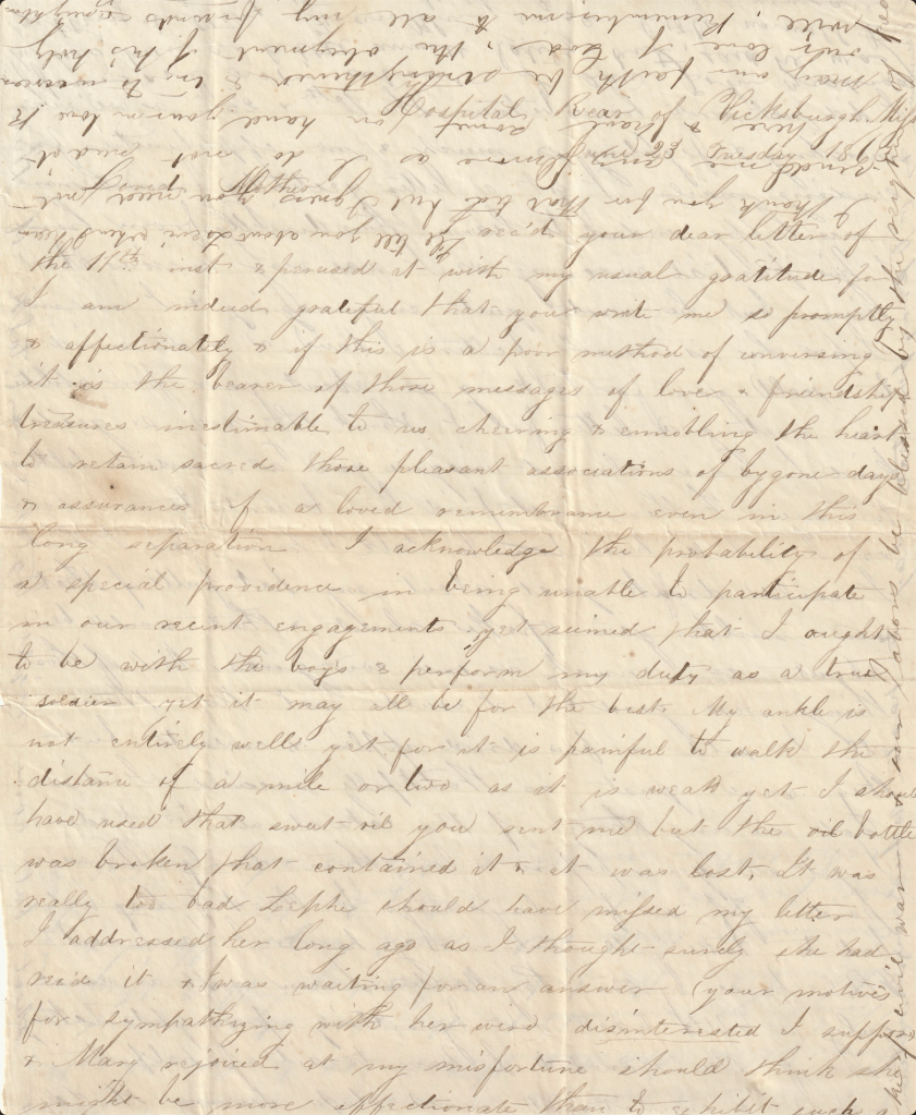 I acknowledge the probability of a special providence in being unable to participate in our recent engagements. Yet it seemed that I ought to be with the boys and perform my duty as a true soldier. Yet, it may all be for the best. My ankle is not entirely well yet for it is painful to walk the distance of a mile or two as it is weak. I should have used that sweet oil you sent me but the bottle was broken that contained it and it was lost.