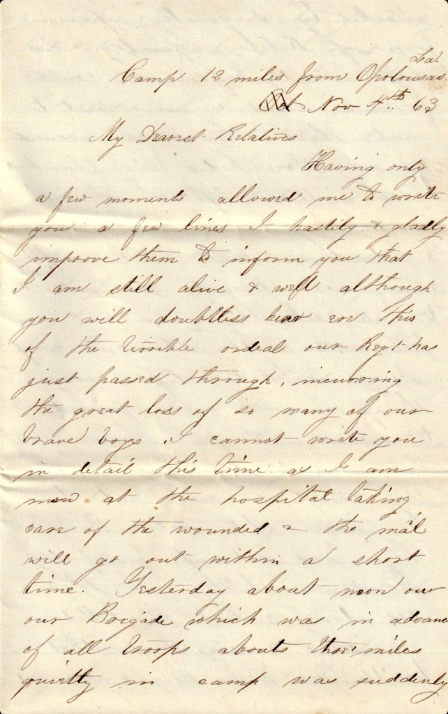 We have lately heard of the brilliant success of our brave hero Gen. Grant & almost wish we could be with him again to share his victories as we think almost everything of him. I have not read the account of the fight [Lookout Mountain & Missionary Ridge] yet but hope to soon. I hope it may prove as great as we hear but I rather doubt it as rumor says he took 60 pieces of Artillery & 20,000 prisoners.