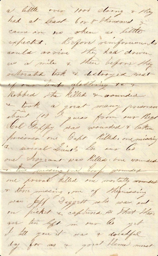 A whole division in three lines of as much as six or seven thousand charged on just our regiment and the battery alone & as the pieces, charge after charge of grape and canister through their ranks, they still came on. At one time their flag was shot down right in front of us and they slightly wavered, but someone grasped it, waving it above his head, when they rallied around it and came on. Their line extended far beyond our left so that there was no force to oppose them at all but some cavalry which could do nothing towards checking their infantry. Those battery boys stood by their pieces like heroes and fired so rapidly that their guns got so hot. Their horses were partly killed and they had to leave pieces be captured by the enemy.