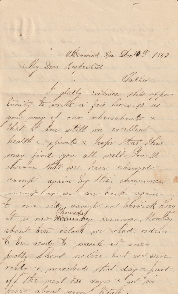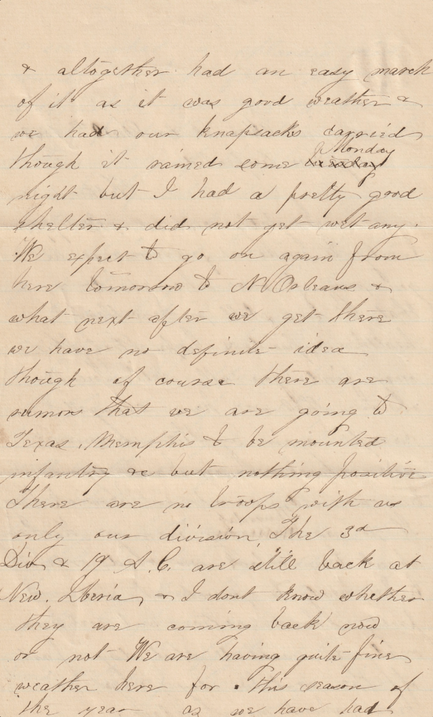 You’ll observe that we have changed camp again by the commencement as we are back again to our old camp on Berwick Bay. It is now Thursday evening. Monday about ten o’clock, we received orders to be ready to march at one—pretty short notice—but we were ready & marched that day & part of the next two days & got in here about noon today & altogether had an easy march of it as it was good weather and we had our knapsacks carried, though it rained some Monday night but I had a pretty good shelter and did not get wet any. We expect to go on again from here tomorrow to New Orleans & what next after we get there, we have not definite idea, though of course there are rumors that we are going to Texas, Memphis & be mounted infantry, &c. but nothing positive. There are no troops with us—only our division. The 3rd Division &19th Army Corps. are still back at New Iberia & I don’t know whether they are coming back now or not.