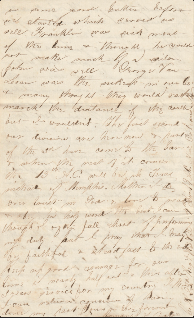We had quite a rain shower last night but today it is pleasant. Where we are camped now the ground is 8 to 12 inches high and the cover around here is fi v e or six inches high & we have a right smart of warm weather too. I saw some peaches on a tree as large as plums and trees look as green as in June at home. We are in the land of crocodiles but as yet I have not seen any. One of the boys found part of one’s hide & gave me a bit of it. John is well and in first rate spirits and appears almost like a new man. Franklin is well. Alex was not sick but was not strong enough to march. Isn’t it singular about our tent boys—only two left for duty; myself and Jefferson Daggett. Alex Thompson, Augustus Thomas, Wm. Jones, Charley Frim, George Partin, and Thomas Loysee & David Jones were left behind at the band unfit for duty. The rest are away in hospitals or dead. Well, I guess if I write much monger you will not be able to read it all for it gets poorer and poorer all the time. Give my love to all and ever remember your affectionate son and brother, — Romanzo
