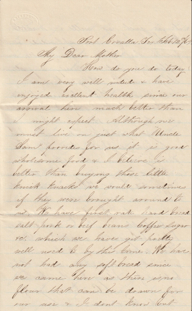 How do you do today? I am very well indeed & have enjoyed excellent health since our arrival here—much better than I might expect. Although we must live on just what “Uncle Sam” provides for us, it is good, wholesome food & I believe is better than buying those little knick-knacks we would sometimes if they were brought around to us. We have first rate hard bread, salt pork or beef, beans, coffee, sugar &c. which we have got pretty well used to by this time. We have not had any soft bread since we came here as there is no flour that can be drawn for our use & I don’t know but it is just as well & healthier.