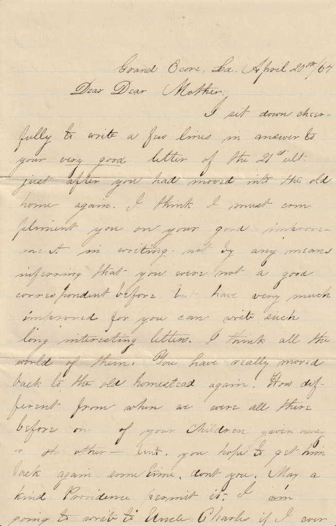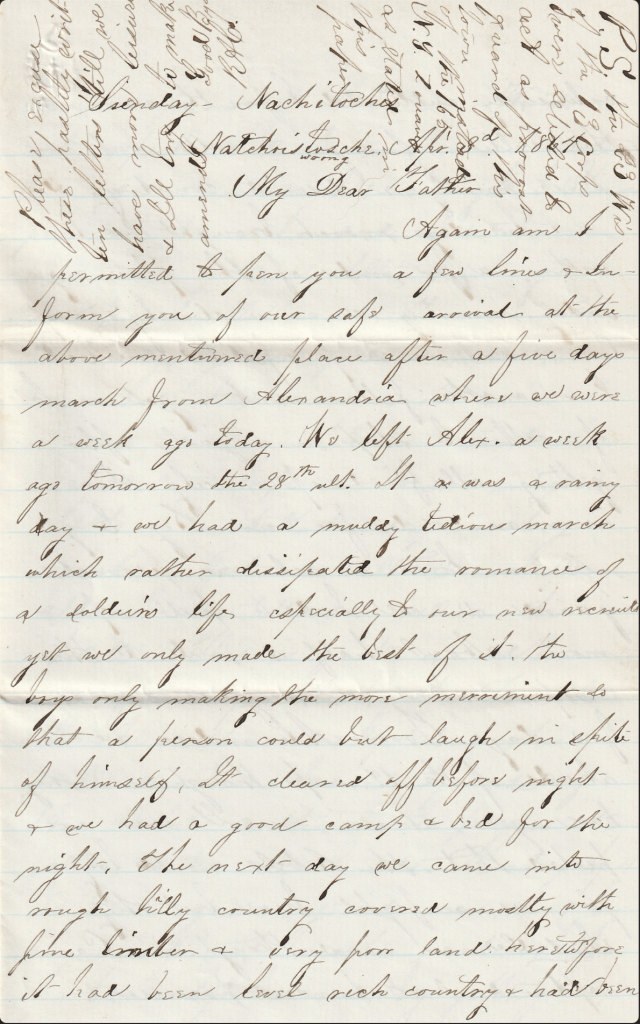I last wrote you or Father at Natchitoches the 3rd & this is the first opportunity since. We left that place the morning of the 6th last Wednesday, our Corps taking the advance with only the cavalry ahead of us, leaving the 19th Corps to follow us & the 16th Corps—Gen. Smith’s forces—to follow them. That day we marched about 16 miles & camped right in the woods & the next day marched 18 miles and camped on Pleasant Hill, the cavalry having quite a severe fight just before evening and got pretty badly used as they ran into a kind of trap the rebs set for them by concealing their front line of men and showing themselves in their rear when our men charged upon them and lost pretty heavily.