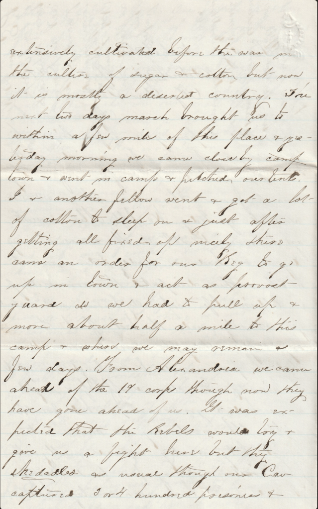From Alexandria we came ahead of the 19th Corps though now they have gone ahead of us. It was expected that the Rebels would try & give us a fight here but they skedaddled as usual though our cavalry captured three or four hundred prisoners & several pieces of artillery. We do not expect them to make any determined resistance till we get to Shreveport—about a hundred miles from here.