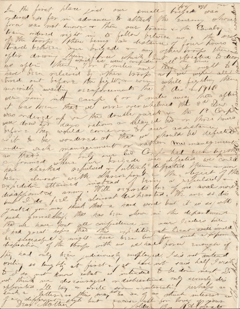 Well, regret are of no avail now, but I do feel almost disheartened. We are so disgusted (you may think that a hard word but it is so) with such generalship that has been shown in this department that we have lost all confidence in our leaders here. I had great hopes that this expedition at least would be successful and it might have been but for such poor disposition of the troops with us. We had forces enough if they had only been judiciously employed. I did not intend writing so lengthy at first and yet have not said half I wish to. I do not know what is intended to be done next. Do not think me discouraged or disheartened—only several disappointed. I’ll try and write soon and interesting perhaps as such a letter as this may not be of much interest as of a different style. But excuse all for love of your soldier boy, — R. Coats