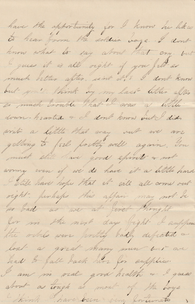 I am going to write to Uncle Charlie if I can have the opportunity for I know he likes to hear from the soldier boys. I don’t know what to say about that cry but I guess it is all right if you felt so much better after, isn’t it? I don’t know but you’d think by my last letter after so much trouble that I was a little down-hearted &I don’t know but I did write a little that way but we are getting to feel pretty well again. You must still have good spirits & not worry even if we do have it a little hard. I still have hope that it will all come out right. Perhaps this affair may not be so bad as we at first thought for the next days fight. I suppose the rebels were pretty badly defeated & lost a great many men but we had to fall back here for supplies.