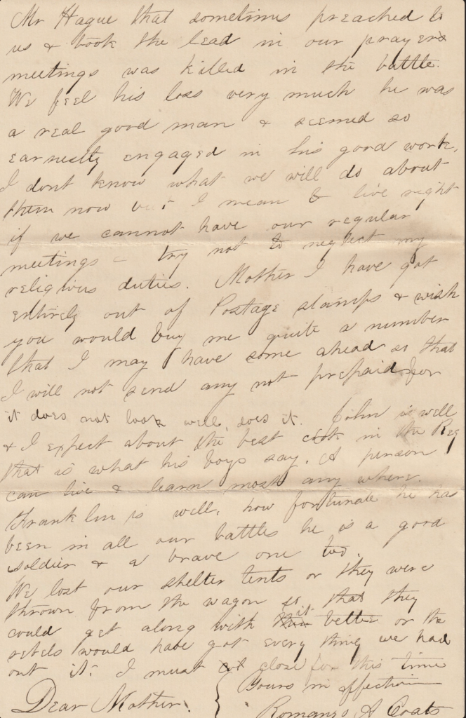Mother, I have got entirely out of Postage stamps & wish you would buy me quite a number that I may have some ahead as that I will not send any not prepaid for it does not look well, does it. John is well & I expect about the best cook in the regiment. That is what his boys say. A person can live & learn most anywhere. Frank is well. How fortunate he has been in all our battles. He is a good soldier & a brave one too. We lost our shelter tents or they were thrown from the wagon so that they could get along with it better or the rebels would have got everything we had out it. I must close for this time. Yours in affection, — Romanzo A. Coats