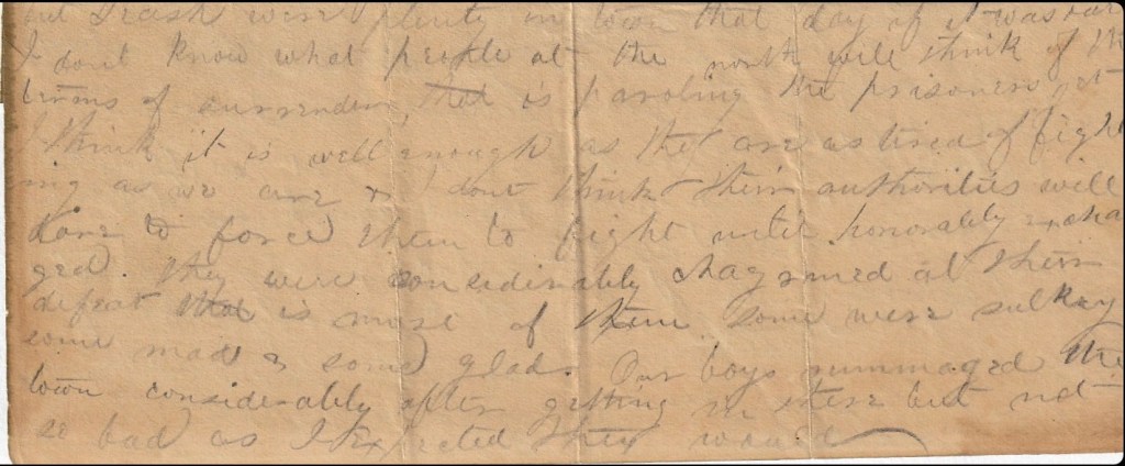 You probably know better than I how many prisoners & guns we took. I have seen no official statement out. I asked men plenty in town that day if it was ours. I don’t know what people in the North will think of the terms of surrender—that is, paroling the prisoners—yet I think it is well enough as they are as tired of fighting as we are and I don’t think their authorities will dare to force them until honorably discharged. They are considerably chagrined at their defeat—that is, most of them. Some were sulky, some mad, and some glad. Our boys rummaged the town considerably after getting in there but not as bad as I expected that they would.