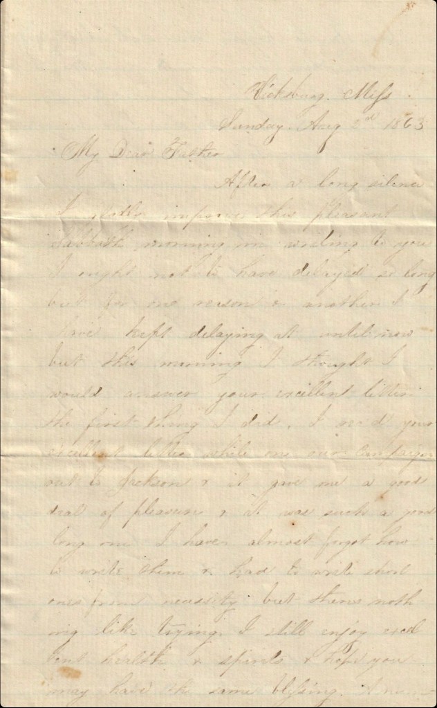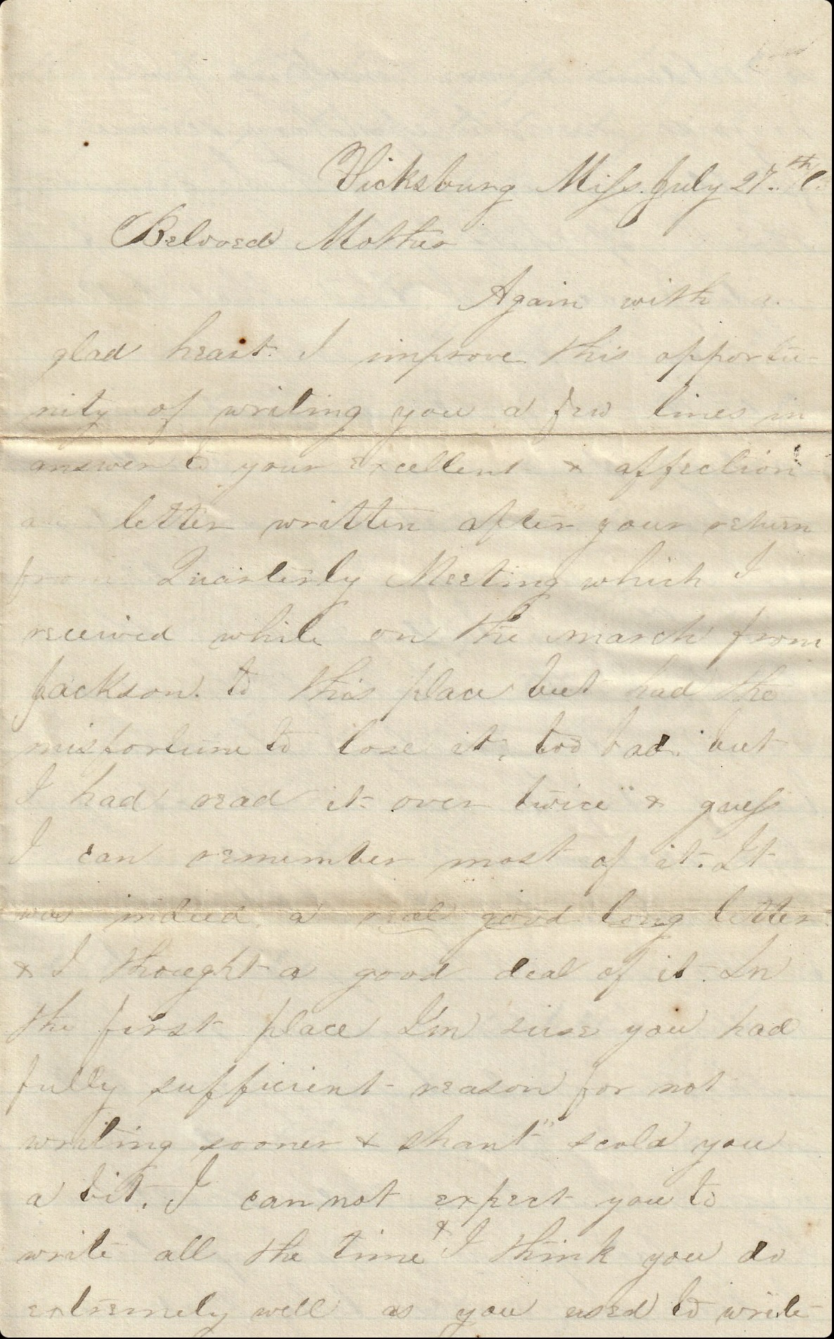 Again, by Gods Providence, I am permitted to address you, informing you of my good health and spirits. We received mail today—the first in a good while and received a letter from you, Father, and Susie on the date respectively June 25th and 22nd adn was very glad to get them and peruse them as usual with interest. You doubtless have heard ere this of the surrender of Vicksburg and today we hear of the surrender of Port Hudson. I wrote you on the 3d inst. the day the flag of truce came out and at 8 o’clock on the 4th, the white flag was hoisted on all the rebels’ forts, and then it was that our hearts were cheered by our final victory and expected immediately to march into town & take possession. But alas for human expectations, we found we were to march to Jackson & rout Johnston, but I was bound to see the town at any rate so I managed to elude the guard & went inside.