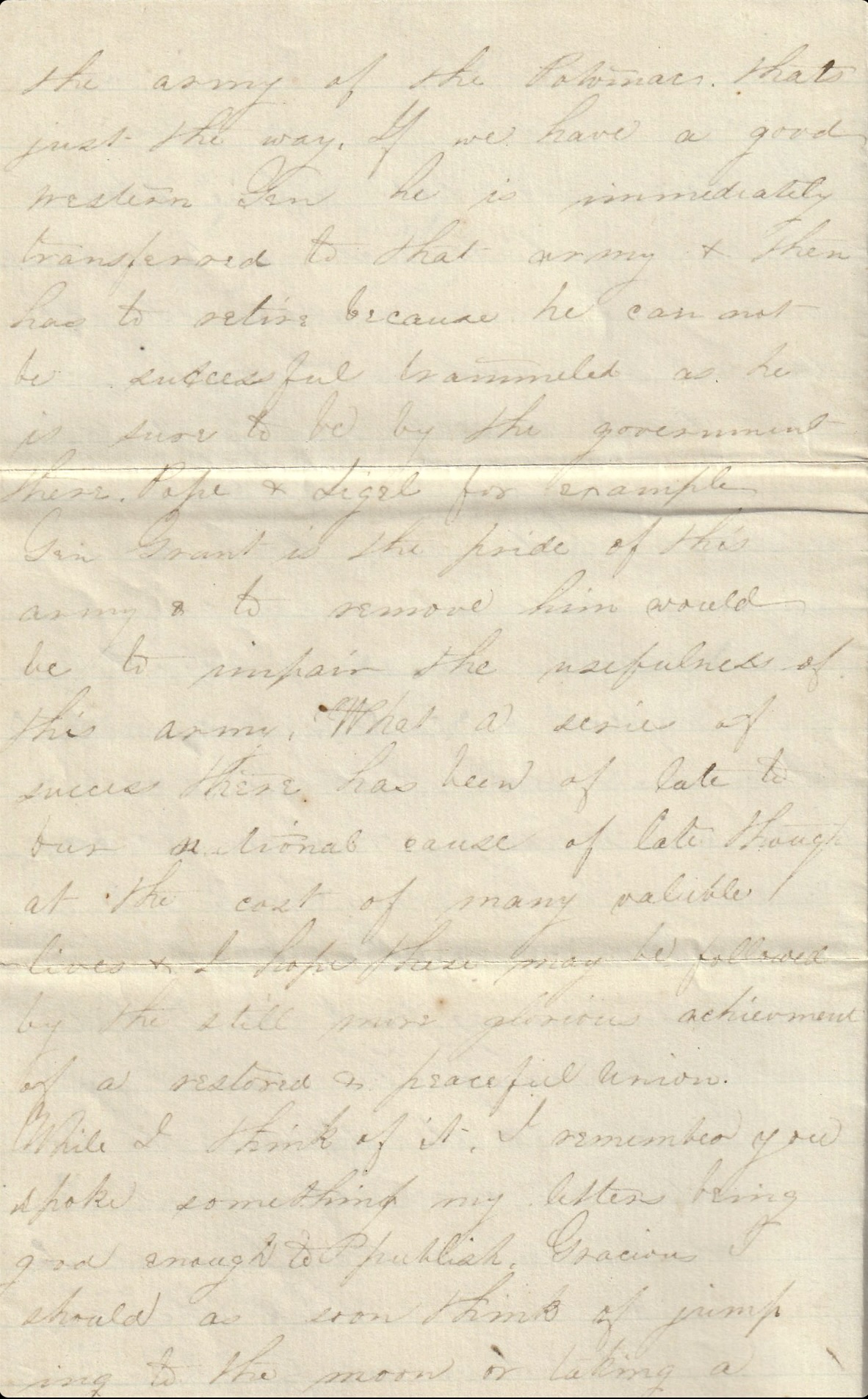 It is a rainy afternoon. We still have the most encouraging news from Sherman’s army. What a successful campaign he has had thus far & I think he will soon gain the prize of Atlanta which will surely prove a serious loss to the rebels. It is too bad Grant should have been unsuccessful in his charge at Petersburg. I’m afraid it will prove a serious drawback for his progress. It must have been some such a disaster as our famous charge on Vicksburg May 22d 1863. That was a terrible day.