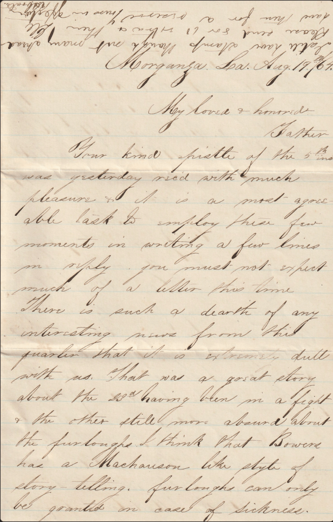 It is with pleasure I hereby acknowledge the receipt of your kind & affectionate letter of the 12th day before yesterday. I am happy to inform you of my good health & spirits & hope these few lines will find you all the same. I am glad you were so thoughtful to send me those stamps as I had sent away the last one I had the same day and although we plenty of money, not a postage stamp can we get here and I shall have to depend on you to furnish me & this currency is to purchase some with and send three or four at a time. Oh Father, if I were only permitted to receive thy counsels as it was my privilege to formerly, how precious it would seem for I do yearn for Christian society, for it is so dreary & lonesome here. When I view the course of life so many adopt in the army, so much profanity & immorality are exhibited, yet I don’t know as this is to be wondered at where so many are brought together, & then the absence of all social restrictions & under strict military laws so different in their moral & religious tendencies from our civil and liberal laws at home, that even old professors go astray & grow cold in their love to their Savior. But i do try to do my duty and live in His love & there seems to be a feeling of peace & security in thus trying in my feeble way to lead the life of a Christian. And how cheering the assurance that I am remembered in your prayers at home. And Father, I do know if I am permitted to return to you, we can live more happily & enjoy each others society much more.