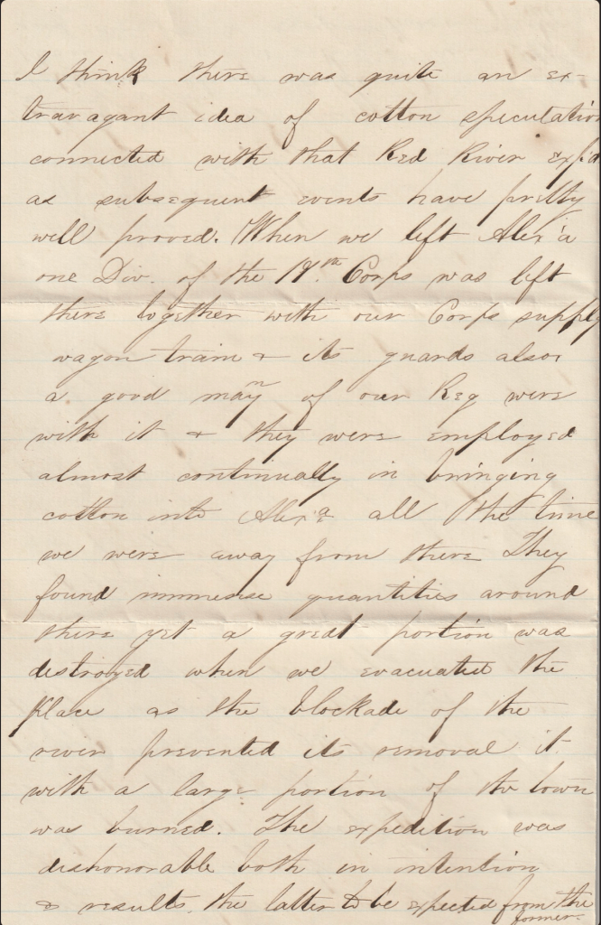 I think there was quite an extravagant idea of cotton speculation connected with that Red River Expedition as subsequent events have pretty well proved. When we left Alexandria, one Division of the 19th Corps was left there together with our Corps supply wagon train & its guards. Also a good many of our regiment were with it & they were employed almost continually bringing cotton into Alexandria all the time we were away from there. They found immense quantities around there, yet a great portion was destroyed when we evacuated the place as the blockade of the river prevented its removal. It with a large portion of the town was burned. The expedition was dishonorable both in intention and results, the latter to be expected from the former.