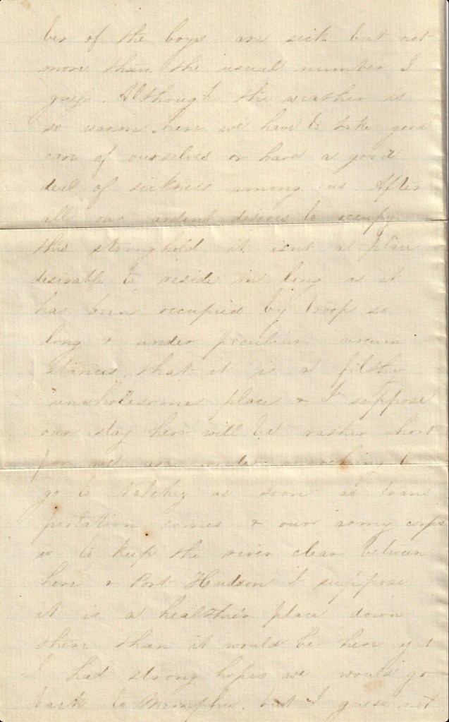 I hardly know when this letter will reach you as we hear the river is blockaded above here at Greenville but I guess it will be but a temporary obstruction. But it deprives us from hearing of the news from Gen. Grant which we are somewhat anxious to hear. I do so earnestly hope that he may be successful for there is so much at stake in the result of that terrible strife for the capture of Richmond. The last we heard, he was on the march again from the scene of a severe seven days fight. May Providence favor him with ultimate success.