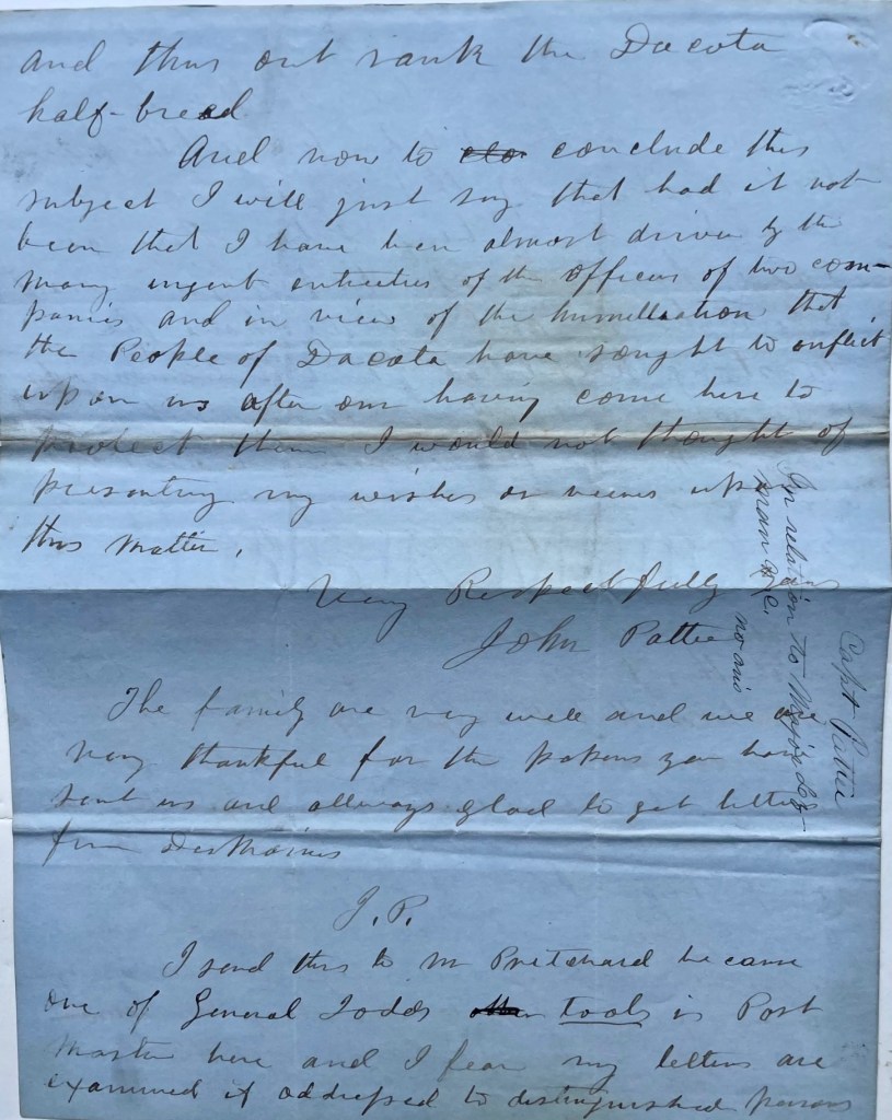 A letter or petition in regard to this matter will leave here by the same mail with this to you. I have not seen it but am told that the object of it is to ask of our companies are detached from the14th that we be allowed the same privilege that has been accorded to most of the troops from Iowa—that of electing our own officers. I will venture one more assertion that it will require but a word or two from you to Secretary Cameron in regard to the importance of this post and so forth to give us a Lieut. Colonel and thus outrank the Dakota halfbreed.