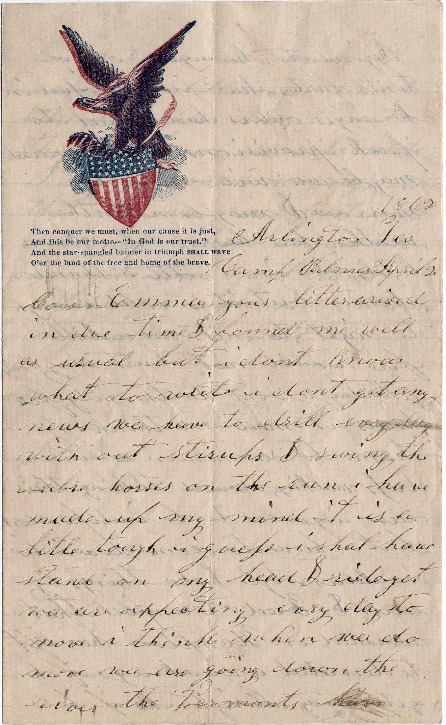 It is beginning to rain and I must prepare for fun, It rained so hard here last week that it drove everyone out of their tents but me. I had my roost on high ground. There, I don’t think of any more to write now & I think I had better close & fix my tent. Direct to Harris Light Cavalry, Co. F, Washington D. C.