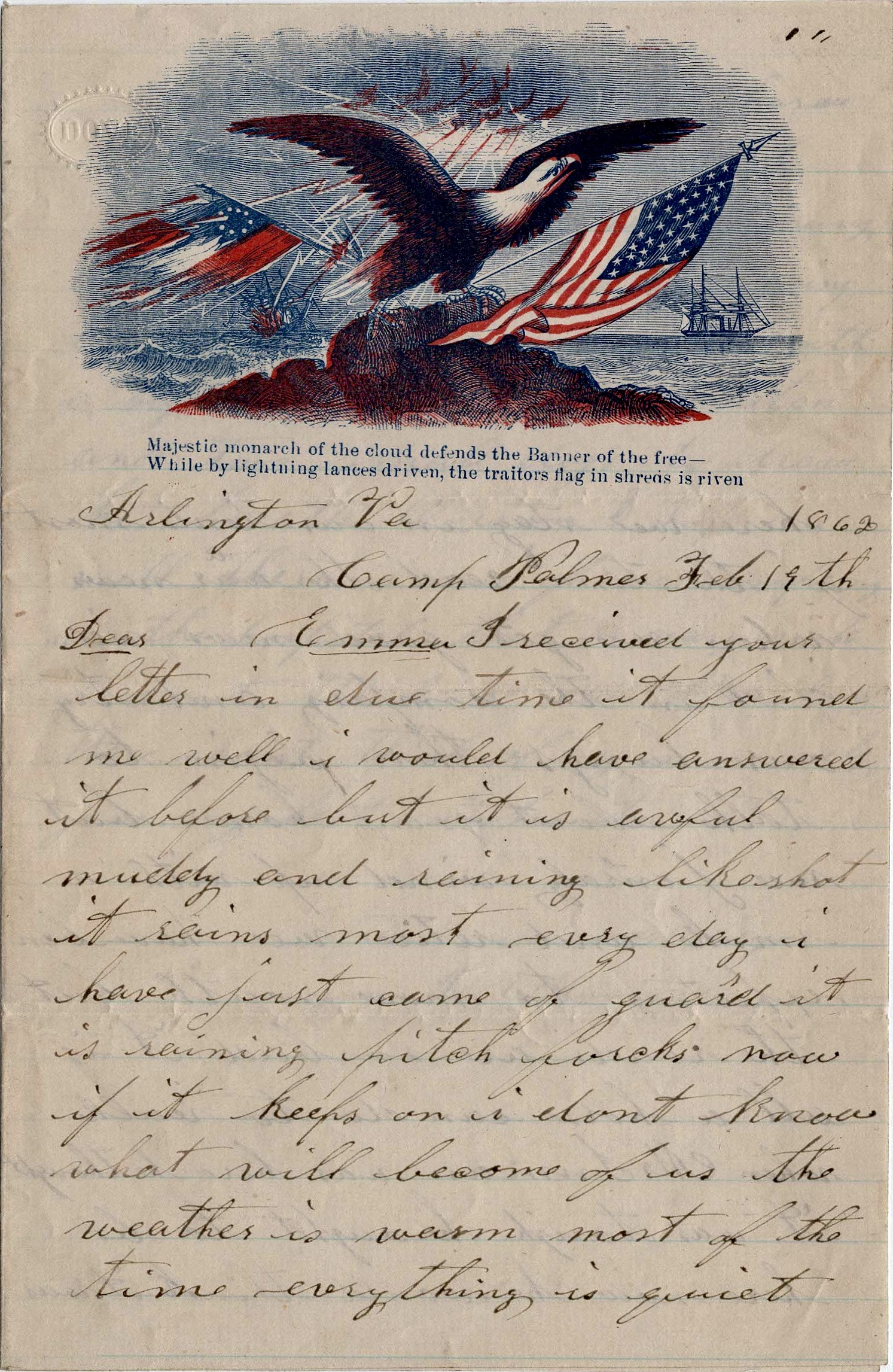 I have just come off guard, It is raining pitch forks now. If it keeps on, I don’t know what will become of us. The weather is warm most of the time. Everything is quiet here. We stay in our tents most of the time & read the war news. When we get good news, we fall in the company and try our lungs. Then begin to talk about going home. But we generally wind up with a smoke and retire.