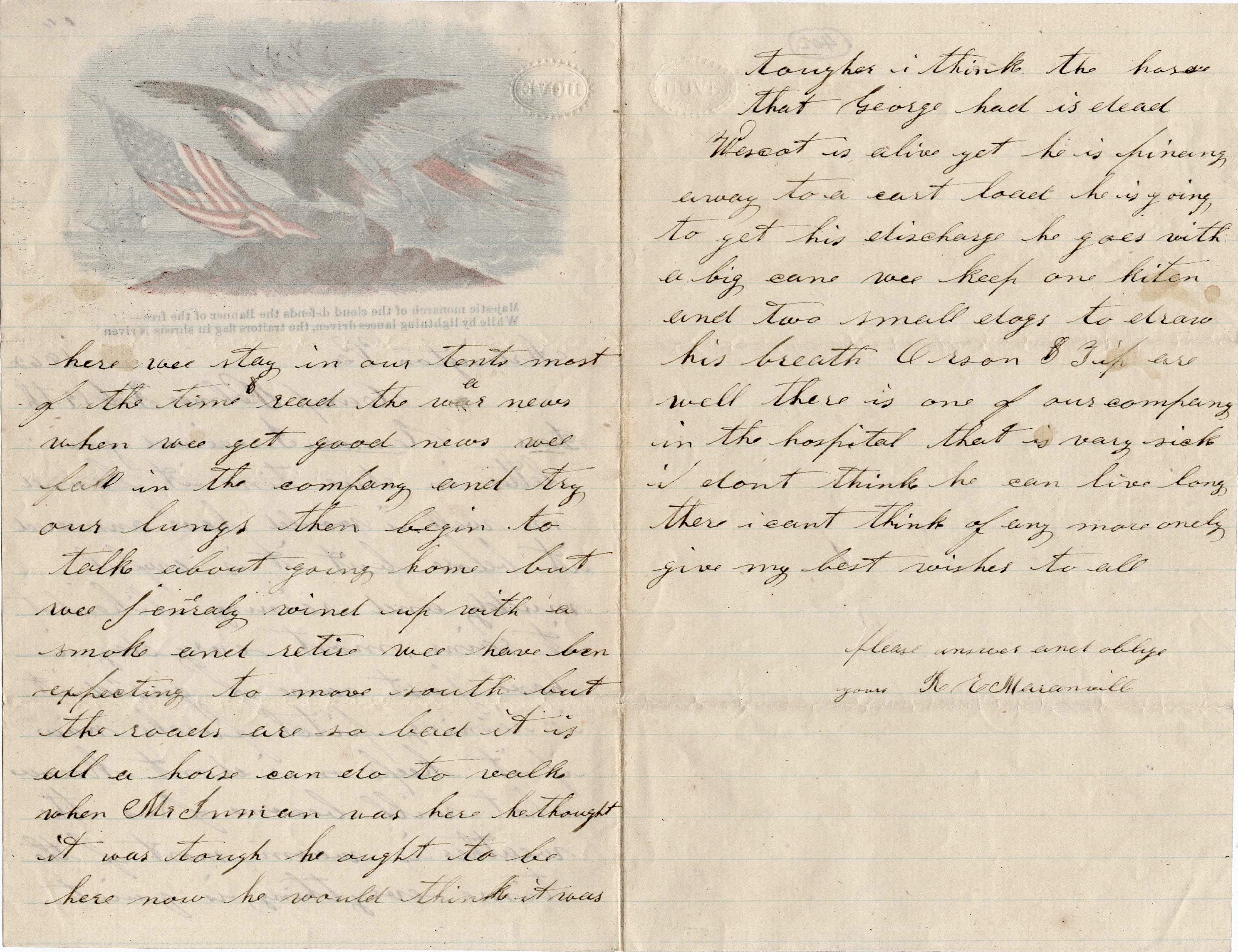 I think the horse that George had is dead. Wescott is alive yet. He is pining away to cart load. He is going to get his discharge. He goes with a big cane. We keep one kitten and two small dogs to draw his breath. Orson & Tip are well. There is one of our company in the hospital that is very sick. I don’t think he can live long.