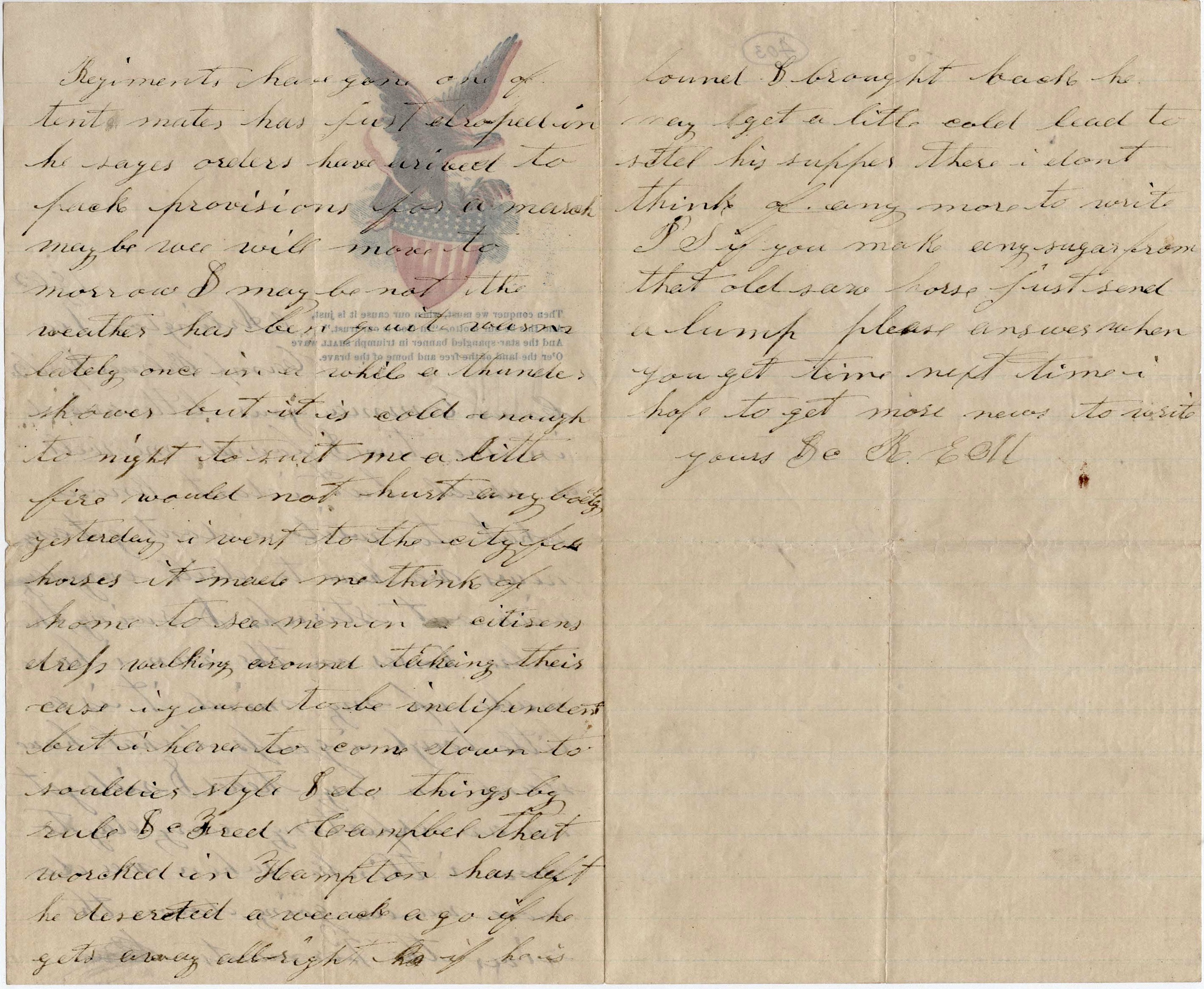 Yesterday I went to the city for horses. It made me think of home to see men in citizen’s dress walking around taking their ease, enjoying [?] to be independent. But I have to come down to soldier’s style. I do things by rule, &c. Fred Campbell that worked in Hampton has left. He deserted a week ago, if he gets away all right. If he is found and brought back, he may get a little cold lead to settle his supper.
