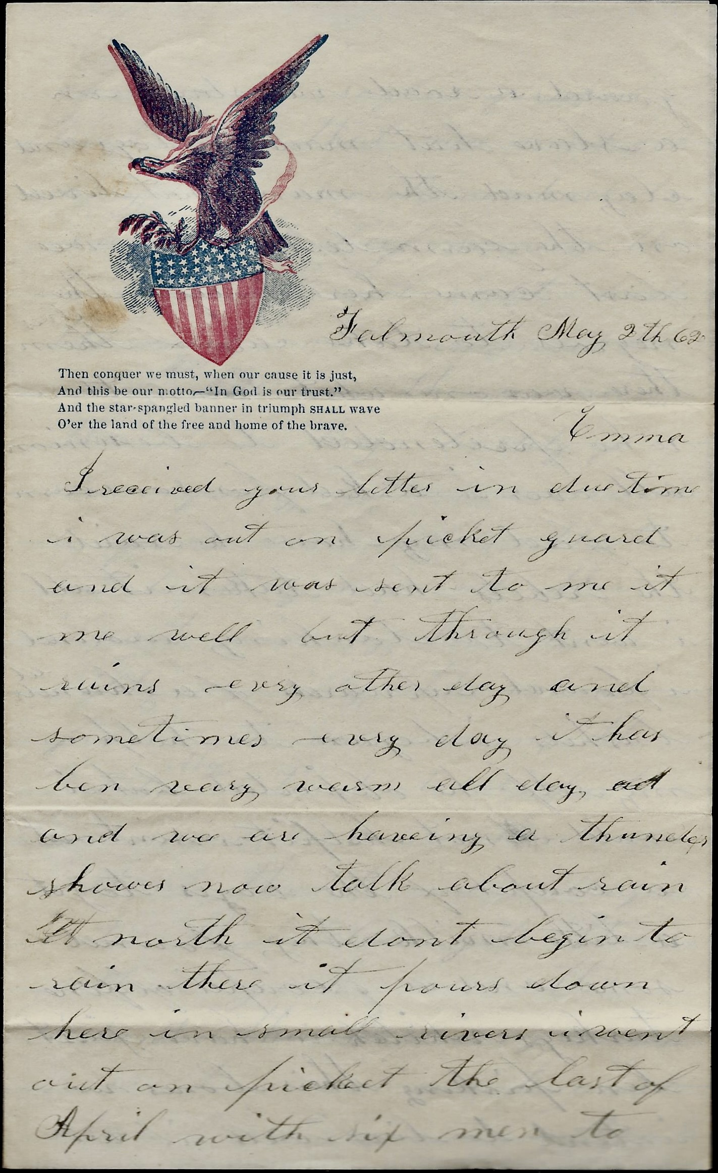 I received your letter in due time. I was out on picket guard and it was sent to me. It [found] me well but [soaked] through. It rains every other day and sometimes every day. It has been very warm all day and we are having a thunder shower now. Talk about rain [in the] North. It don’t begin to rain there. It pours down here in small rivers.