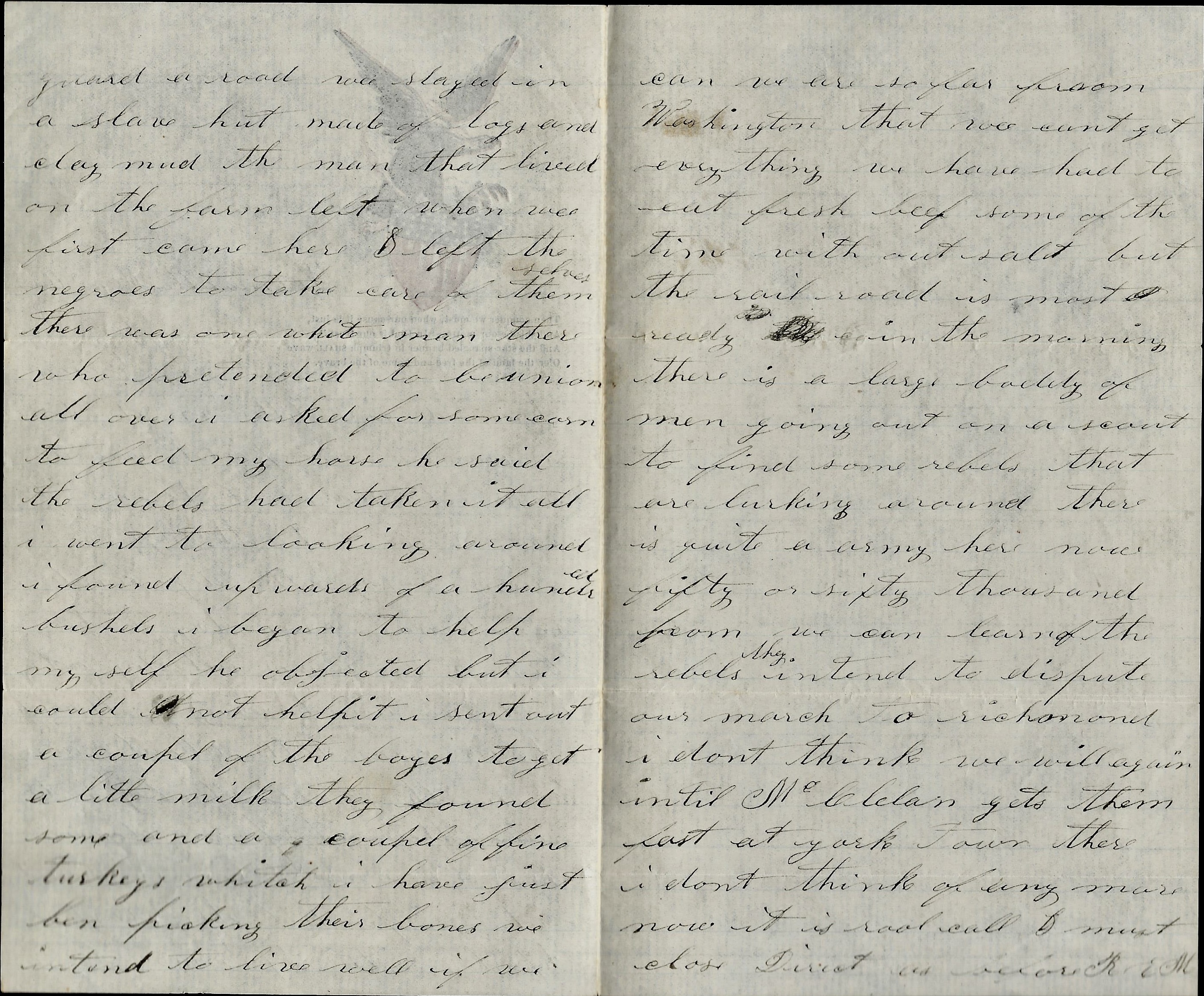 I went out on picket the last of April with six men to guard a road. We stayed in a slave hut made of logs and clay mud. The man that lived on the farm left when we first came here & left the negroes to take care of themselves. There was one white man there who pretended to be Union all over. I asked for some corn to feed my horse. He said the rebels had taken it all [but when] I went to looking around, I found upwards of a hundred bushels. I began to help myself. He objected but I could not help it. I sent out a couple of the boys to get a little milk. They found some and a couple of fine turkeys which I have just been picking their bones. We intend to live well if we can. We are so far from Washington that we can’t get everything. We have had to eat fresh beef some of the time without salt but the railroad is [al]most ready.