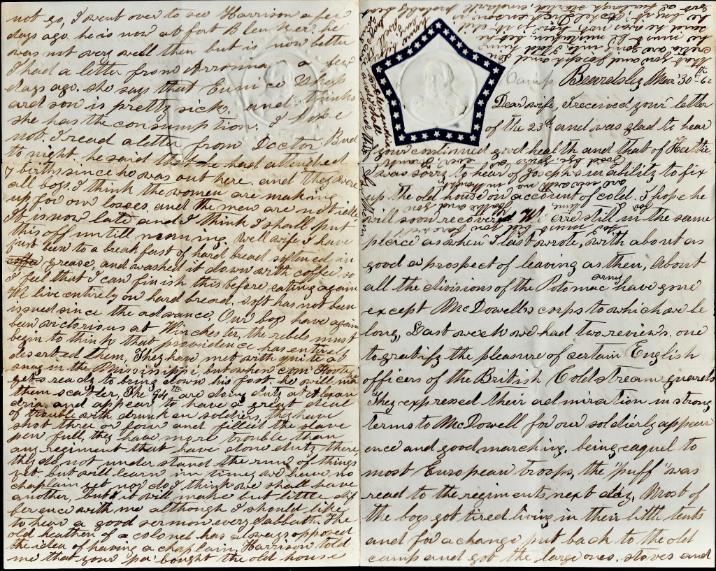 We are still in the same place as when I last wrote with about as good a prospect of leaving as then. About all the divisions of the Potomac Army have gone except McDowell’s Corps to which we belong. Last week we had two reviews—one to gratify the pleasure of certain English officers of the British Coldstream Guards. They expressed their admiration in strong terms to McDowell for our soldierly appearance and good marching, being equal to most European troops. The “puff” was read to the regiments next day.