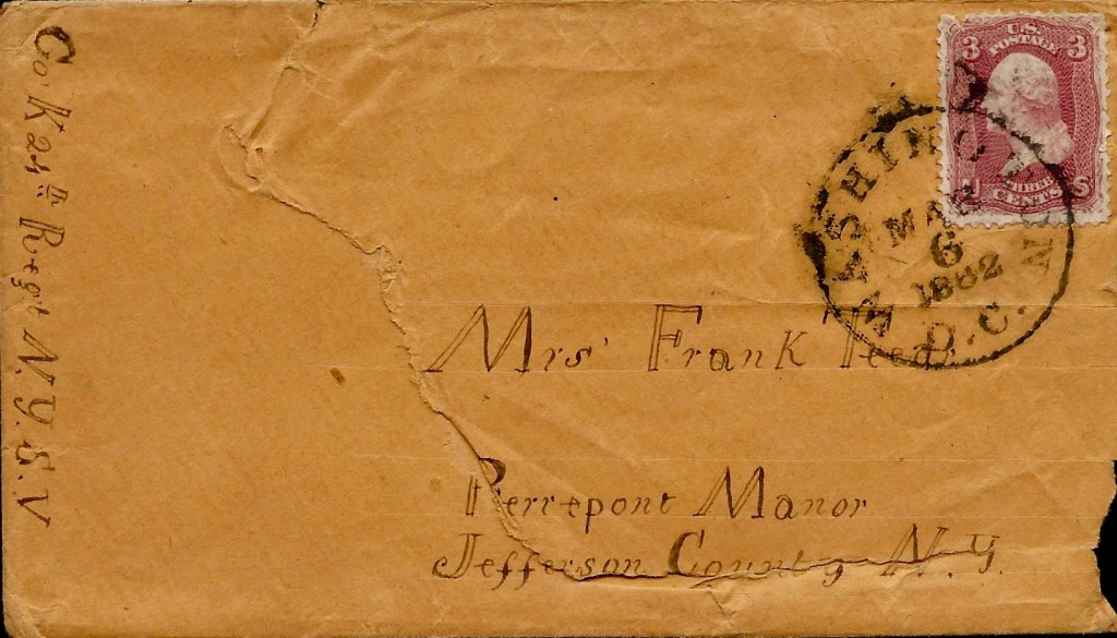 The following letters were written by 29 year-old Francis (“Frank”) Teear (1833-1862) of Pierrepont Manor, Jefferson county, New York, who enlisted in Co. K, 24th New York Infantry and was killed in action at the Second Battle of Bull Run on 31 August 1862. Prior to his death, Frank had been promoted to a sergeant.