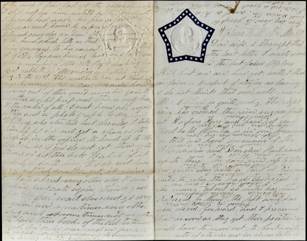 I thought that the last letter I wrote would be the last from Upton’s Hill, but we are here yet with I think as fairer a prospect of staying as leaving. I do not think that our noble Gen’l McClellan is quite ready. The right wing has crossed the river successfully at Harpers Ferry and have got good foothold. Vienna is in our possession so that we have possession of the Alexandria and Louden Railroad up to there. The cars run up to Vienna yesterday with a load of ties and rails to re-lay the track destroyed by the enemy. About 20 miles has been destroyed by them.