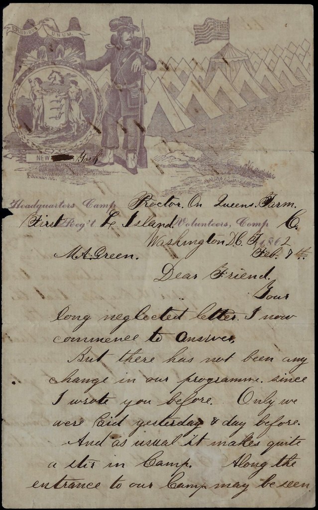 Warren H. is still in the Brigade Hospital but is getting so he will be on duty soon now. His brother is on duty here now. Co. C are all on duty now, hearty & tough as bucks. We were on picket duty yesterday. All we had to do was to go to the camp of the 31st Pennsylvania Regt. to mount guard & then we came to quarters to stay unless called upon to support the Grand Guard in case of an attack.
