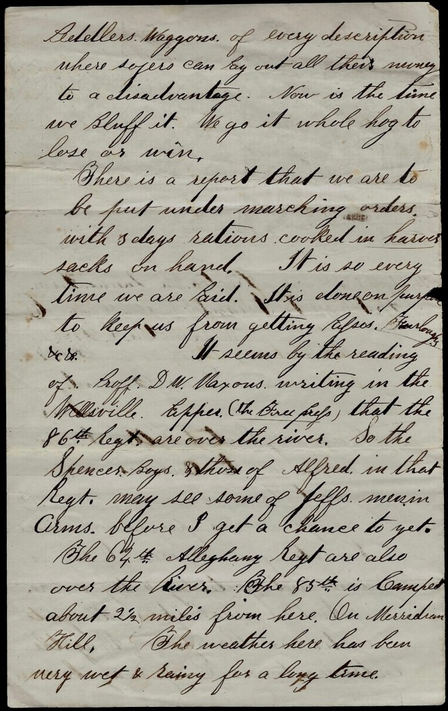 There is a report that we are to be put under marching orders with three days rations cooked in haversacks on hand. It is so every time we are paid. It is done on purpose to keep us from getting passes, furloughs, &c. &c. It seems by the reading of Prof. D. W. Maxous writing in the Wellsville paper (the Free Press) that the 86th Regt. are over the river so the Spencer boys & those of Alfred in that regiment may see some of Jeff’s men in arms before I get a chance to yet.
