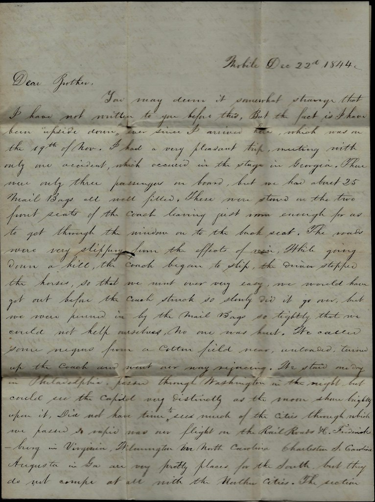 You may deem it somewhat strange that I have not written to you before this, but the fact is I have been “upside down” ever since I arrived here, which was on the 19th of November. I had a pleasant trip, meeting with only one accident which occurred in the stage in Georgia. There were only three passengers on board but we had about 25 mail bags all well filled. These were stowed on the two front seats of the coach, leaving just enough for us to get through the window onto the back seat. The roads were very slippery from the effects of the rain. While going down a hill, the coach began to sli, the driver stopped the horses, so that we went over very easy. We would have got out before the coach struck so slowly did it go over, but we were penned in by the mail bags so tightly that we could not help ourselves. No one was hurt. We called some negroes from a cotton field near, unloaded, turned up the coach, and went on our way rejoicing.