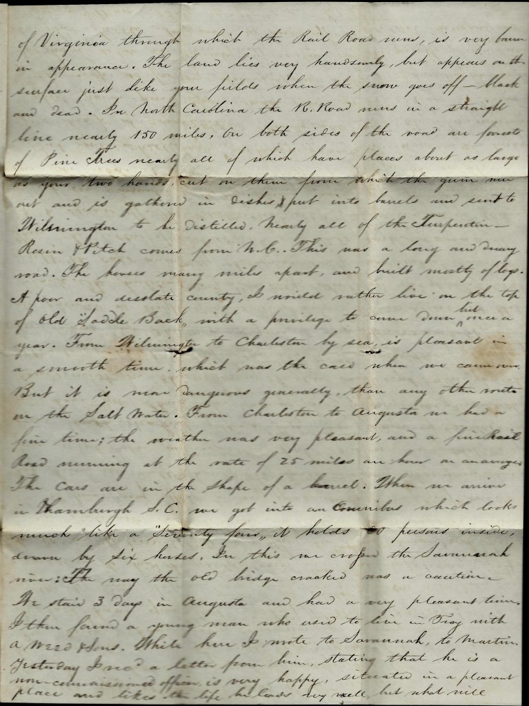 We staid one day in Philadelphia, passed through Washington in the night but could see the Capitol very distinctly as the moon shone brightly upon t. Did not have time to see much of the cities through which we passed so rapid was our flight on the rail roads &c. Fredericksburg in Virginia, Wilmington in North Carolina, Charleston, S. Carolina, Augusta in Georgia are very pretty places for the South but they do not compare at all with the northern cities. The section of Virginia through which the rail road runs is very barren in appearance. The land lies very handsomely but appears on the surface just like your fields when the snow goes off—black and dead.