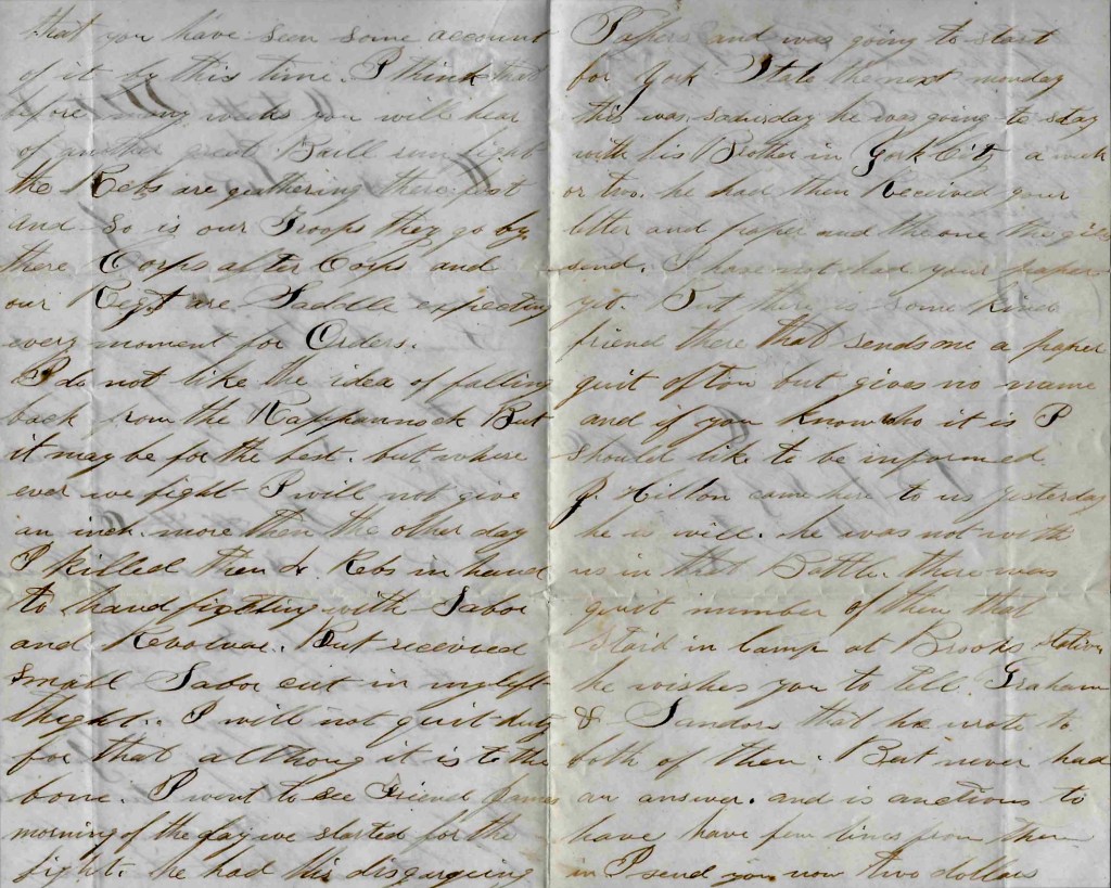 J[ames] Hilton came here to us yesterday. He is well. He was not with us in that battle. There was quite a number of them that staid in camp at Brooks Station. He wishes you to tell Graham & Sanders that he wrote to both of them but never had an answer and is anxious to have a few lines from them. 1