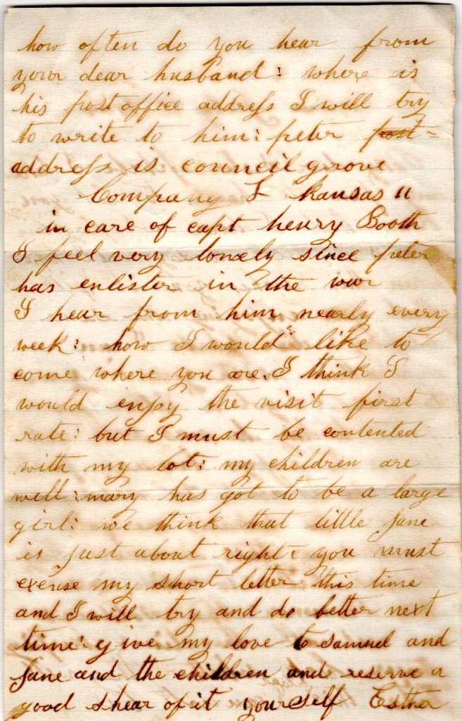 How often do you hear from your dear husband? Where is his post office address. I will try to write to him. Peter’s address is Council Grove, Company L, Kansas 11th, in care of Captain Henry Booth.