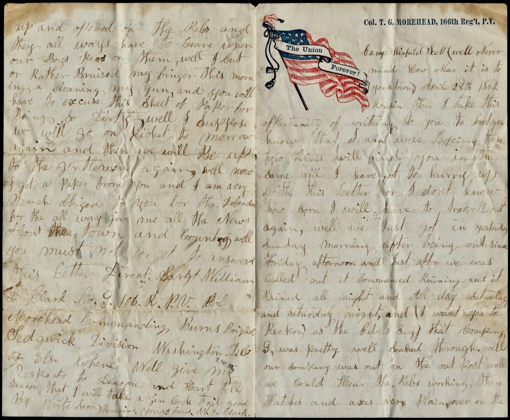 Well, you must not forget to answer this letter. Direct to Sergeant William J. Clark, Co. G, 106th Regiment P. V., Col. Morehead Commanding, Burns Brigade, Sedgwick’s Division, Washington D. C. or elsewhere.
