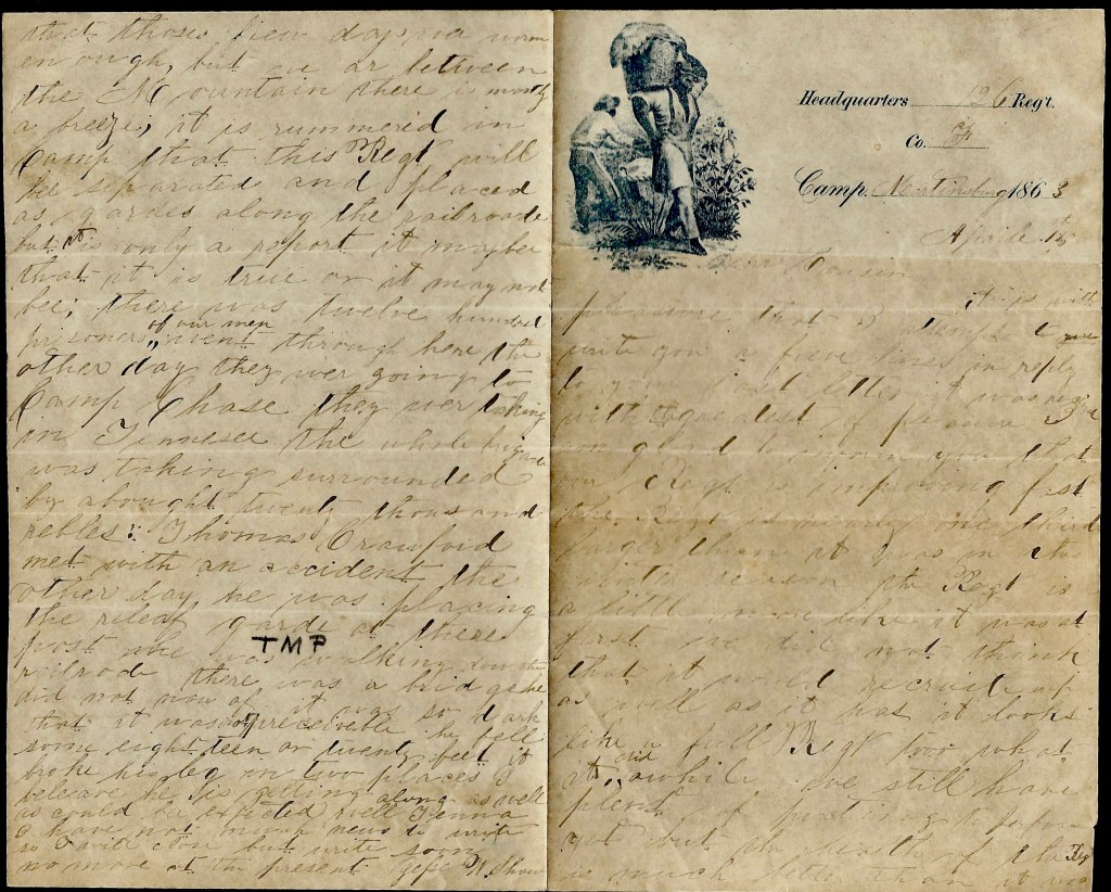 Thomas Crawford met with an accident the other day [when] he was placing the relief guard at their post. He was walking down the railroad. There was a bridge he did not know of. It was so dark that it was imperceivable. He fell some eighteen or twenty feet. It broke his leg in two places. I believe he is getting along as well as could be expected.