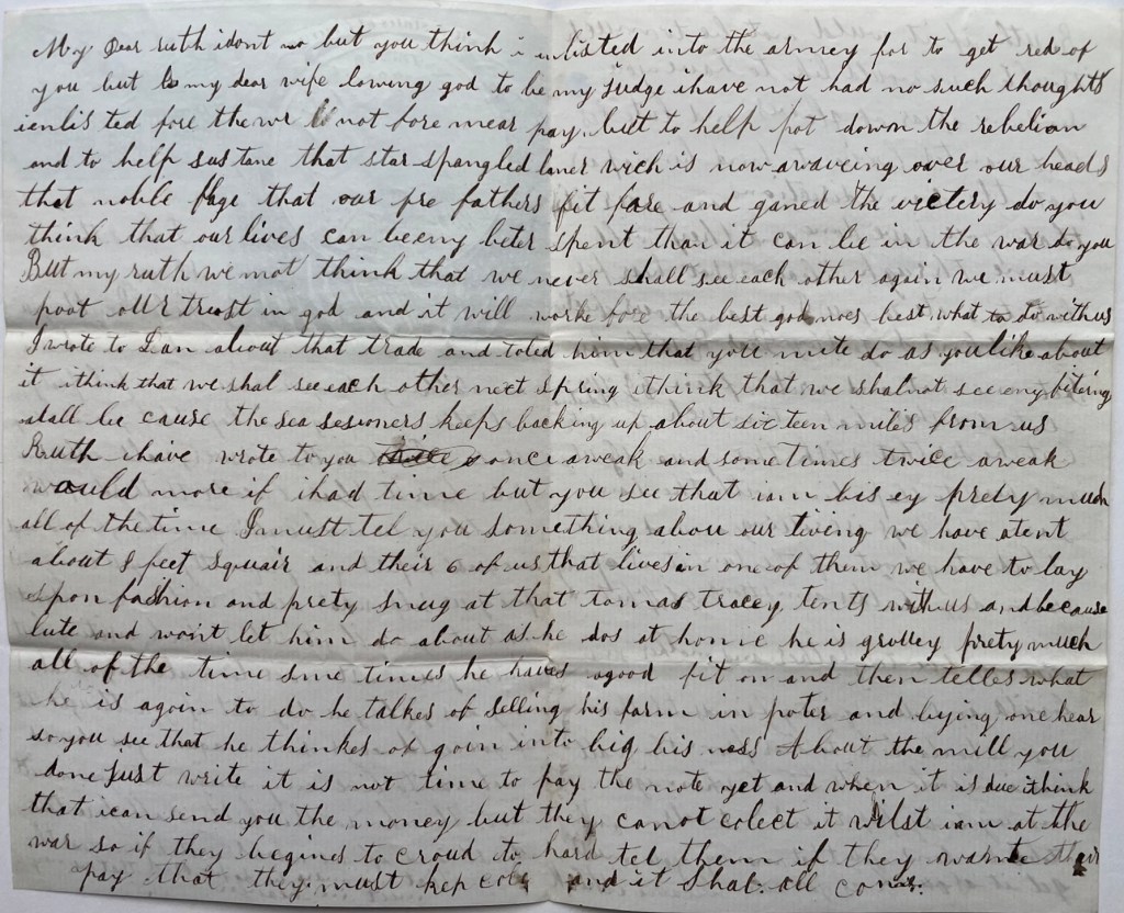 My dear Ruth, I don’t know but you think I enlisted into the army for to get rid of you but my dear wife, allowing God to my judge, I have not had no such thoughts. I enlisted for the war not for mere pay, but to help put down the rebellion and to help sustain that star spangled banner which is now a waving over our heads—that noble flag that our fore fathers fought for and gained the victory. Do you think that our lives can be any better spent than it can be in the war? Do you? But my Ruth, we mustn’t think that we never shall see each other again. We must put all trust in God and it will work for the best. God knows best what to do with us.