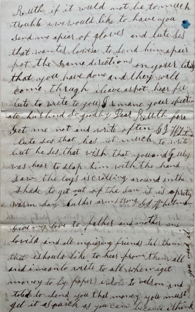Ruth, if it would not be too much trouble, I would like o have you send me a pair of gloves and Lute says that he wants Louisa to send him a pair. Put the same directions on your letters that you have done ad they will come through. I leave a spot here for Lute to write to you. I remain your affectionate husband. So goodbye. — G. J. Whitman
